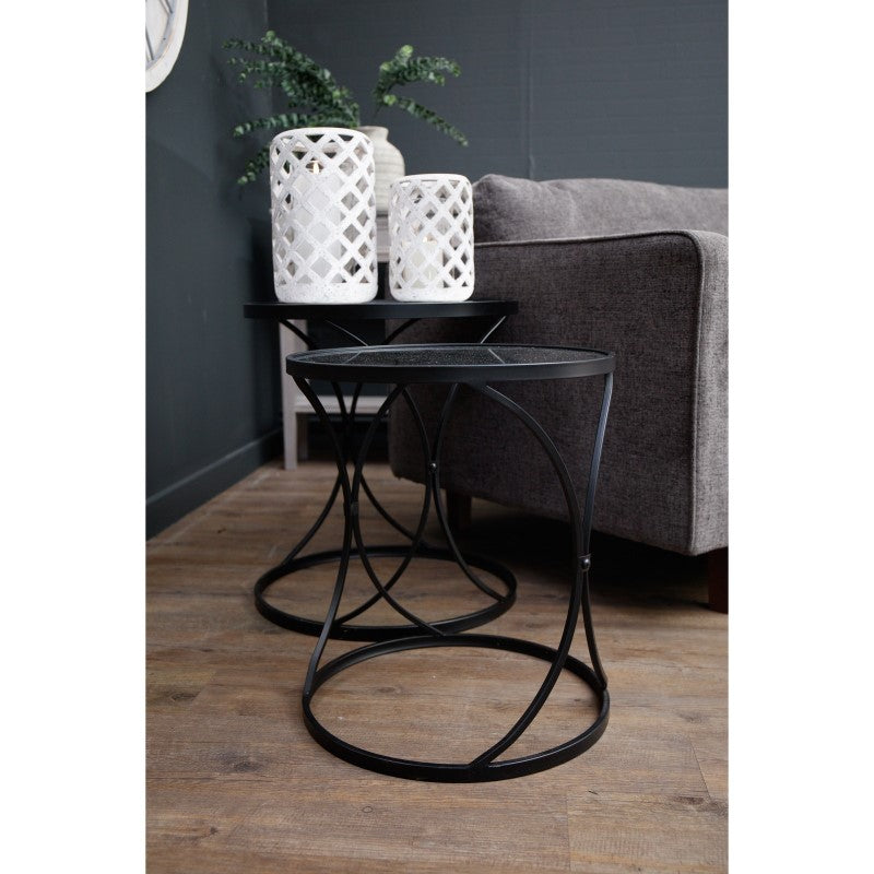 These side tables pair beautifully with sleek bar stools, textured cocktail shakers, or LED accent lighting for an elegant, elevated look. The black metal silhouette complements both minimalist and luxe interiors, allowing seamless integration with dark woods, marble countertops, or metallic accents often found in modern bar setups.