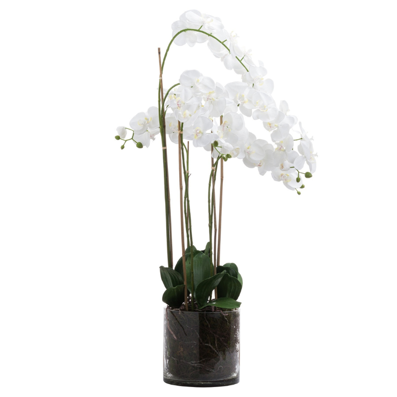 Crafted with lifelike attention to detail, each tall orchid stem features delicate white blossoms, lush green leaves, and realistic roots nestled in a clear glass pot. The glass vessel enhances the modern aesthetic, showcasing the intricacy of the orchid’s base while blending seamlessly with both contemporary and classic décor styles. Its tall, commanding presence makes it an eye-catching accent on bar counters, shelves, and console tables, creating a serene and inviting atmosphere.