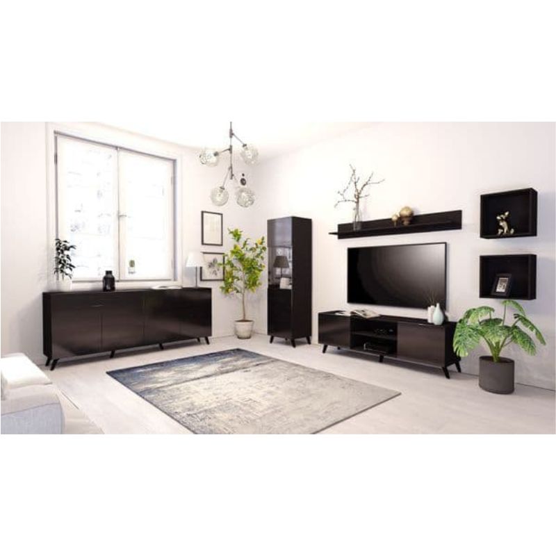 The Oslo Tall Drinks Cabinet offers a stylish and functional storage solution with a distinctly modern edge. Its matte black finish and vertically ribbed door panels create a bold, textural statement, while the central glass display section allows for elegant presentation of bottles, glassware, or curated décor. This slim-profile cabinet stands on angled legs that lend a mid-century feel, elevating it both literally and aesthetically. With ample shelving hidden behind the doors and a visually striking open display, it’s a perfect fit for contemporary home bars or living spaces.