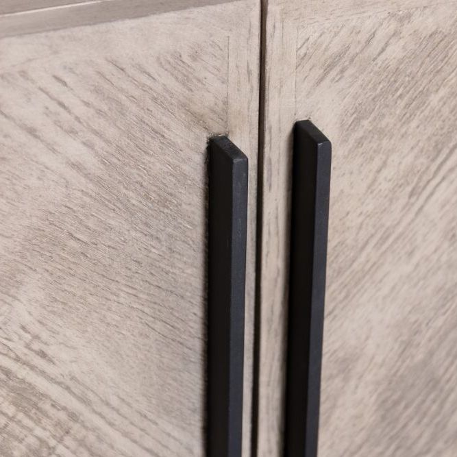 The Tiverton TV Unit features a wide, functional design ideal for large flat-screen TVs, making it a perfect addition to your entertainment space. Its sleek black steel frame and modern black handles provide a contemporary contrast to the warm wood tones, while the chevron-patterned cabinet fronts add stylish texture and design appeal. This mix of industrial and traditional elements makes it particularly suited for luxury home bars, where sophistication and function go hand in hand.