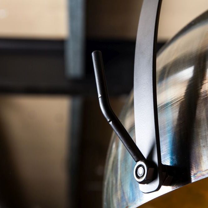 The exterior of the shade features a distinctive black dappled oil finish, while the interior is lined with a luxurious gold leaf effect that reflects warm, ambient light—ideal for creating a cosy yet stylish atmosphere in your bar area. The pendant is not just about looks; its standout feature is a functional industrial-style lever mechanism, allowing the angle of the shade to be adjusted for a customizable lighting experience.